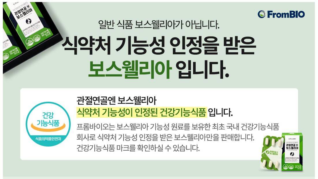 먼저, 보스웰리아를 관절 영양제로 선택할 때 건강기능식품 마크가 있는지 확인해야 합니다. 건강기능식품 마크가 없는 제품은 보스웰리아 효능이 입증되지 않은 일반적인 식품으로 간주됩니다.