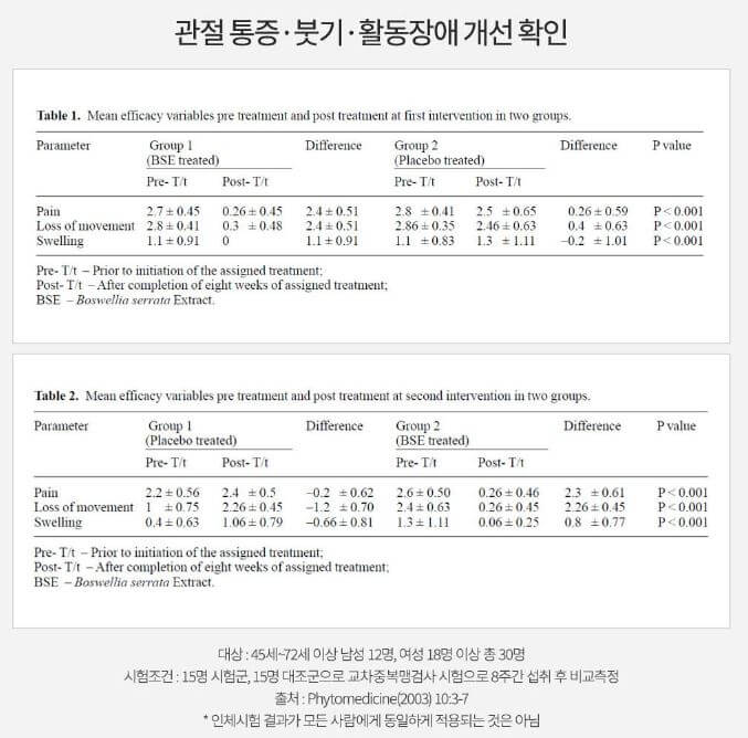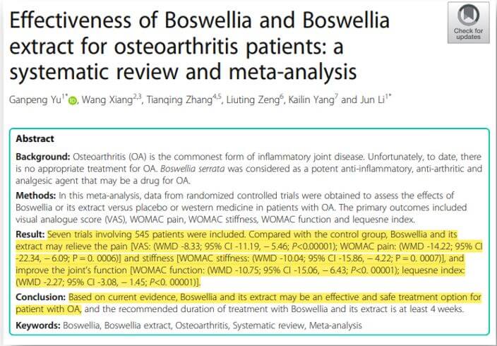 결과에 따르면, "545명의 환자를 대상으로 한 7건의 인체적용시험을 분석한 결과, 보스웰리아를 관절 영양제로 복용한 환자군에서 관절 통증 및 강직(뻣뻣함)이 대조군에 비해 완화되었으며, 관절 기능도 향상되었습니다. 현재까지의 증거를 바탕으로 보면, 보스웰리아와 그 추출물은 골관절염 환자에게 효과적이고 안전한 치료 옵션으로 고려될 수 있습니다."