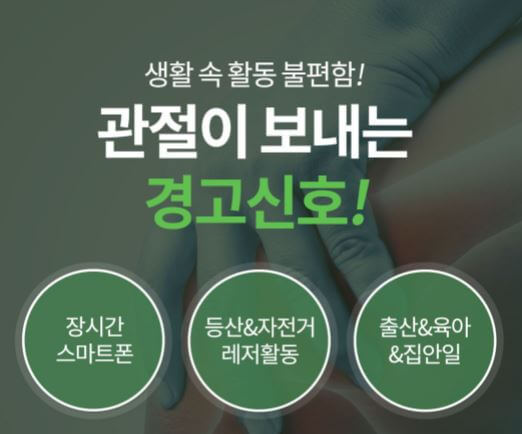 관절은 혈관과 신경이 없기 때문에 마모되어도 자각 증상이 없어 대수롭지 않게 방치하기 십상인데 결국 골관절염이나 류머티즘 관절염으로 진행된다고 합니다. 저도 골관절염 초기까지 진행되었고 오래 걷는다거나 서 있으면 관절 통증 때문에 움직임이 많이 제한되었습니다. 그냥 먼발치에서 뛰어노는 아이들을 피곤하다는 핑계로 우두커니 바라보는 제가 어찌나 답답했는지 이루말을 드릴 수가 없네요.