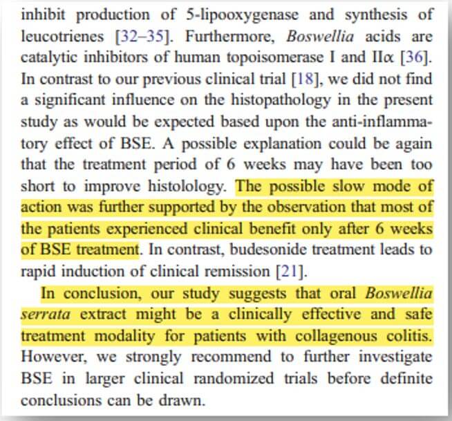 "보스웰리아를 관절 영양제로 6주 동안 섭취한 환자들은 임상적 개선이 나타났습니다.... 결론적으로, 이 연구는 보스웰리아 세라타 추출물의 섭취가 염증성 장질환 환자에게 임상적으로 효과적이고 안전한 치료법으로 고려될 수 있음을 시사합니다."